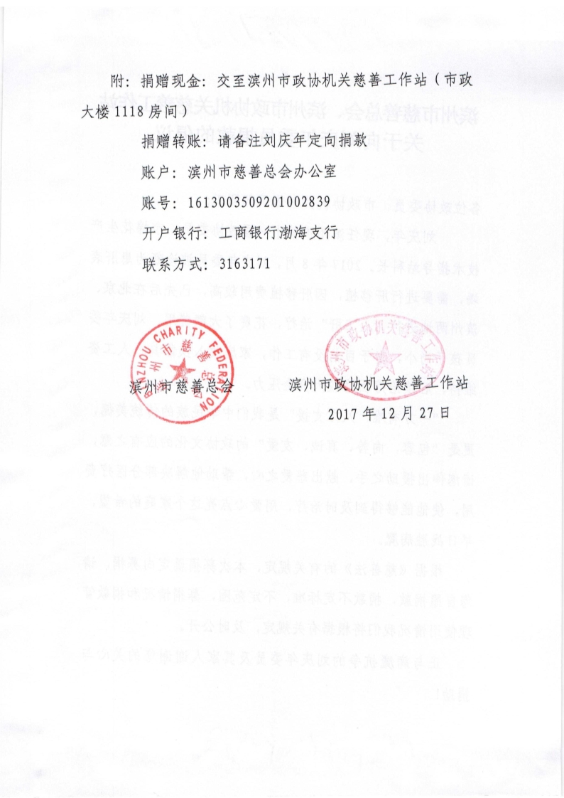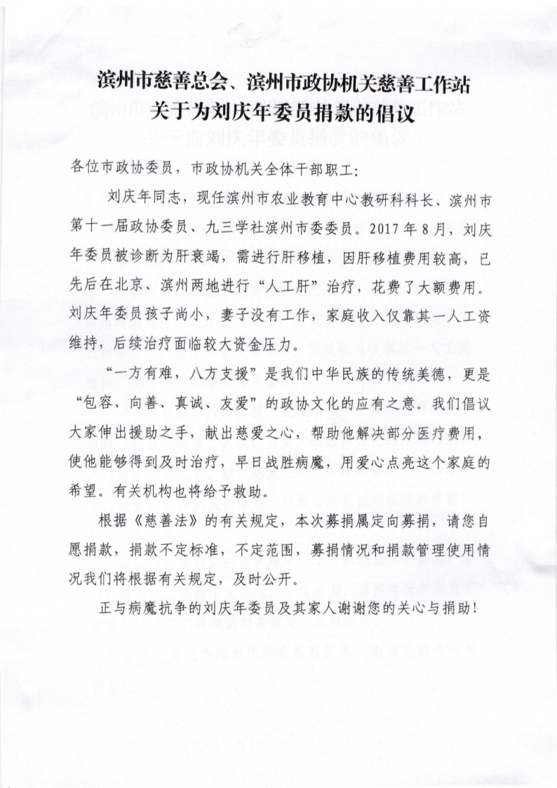 滨州市慈善总会、滨州市政协机关慈善工作站关于为刘庆年委员捐款的倡议