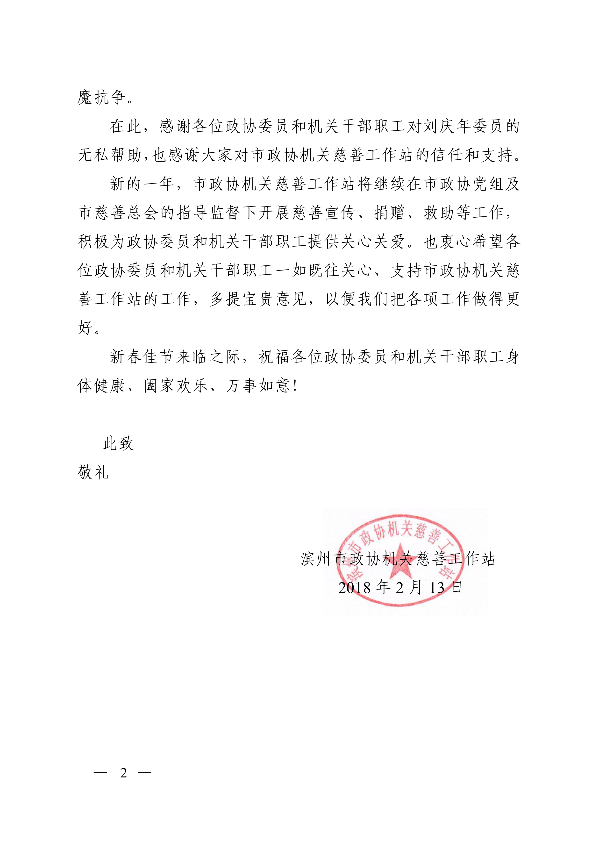 滨州市政协机关慈善工作站——感谢信